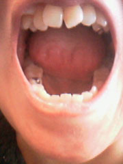 口を閉じて正面から見ると、受け口だと分かりにくいのですが、反対咬合です。前歯も隙があり、歯も重なりあう部分があり、ガタガタです。
