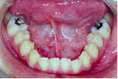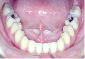 下の歯が上の歯より前に出て前歯は咬めていません。左上の第2小臼歯は骨の中に埋まっています。