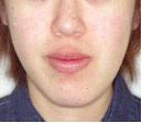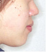 上あごは左へ2mm,前方へ2mm(Le Fort 1型)、下あごは右後方へ3.5mm,正面右へ3mm、左後方へ2.5mm(IVRO)、また顔のバランスをとるためあごの先を前方に5mm移動しました。(genioplasty)手術が終わり、退院当日にできるだけ来院していただきます。この方は手術後13日目でした。