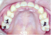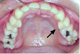 下の歯が上の歯より前に出て前歯は咬めていません。左上の第2小臼歯は骨の中に埋まっています。